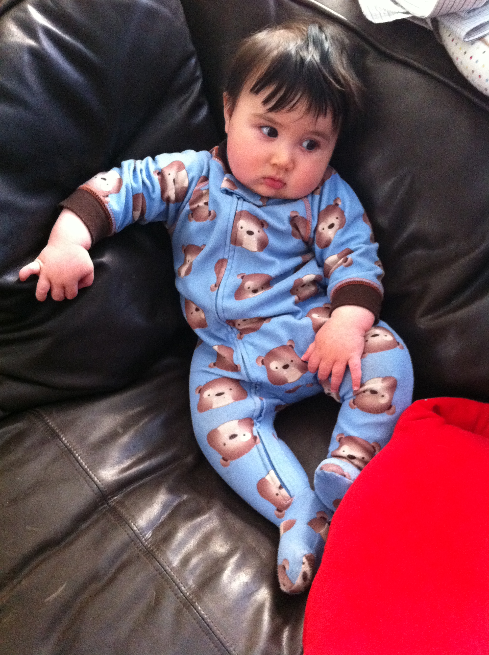 Right now you love to use your hands. You smack and hit your way to what you want or to get rid of what you don’t want. You love to manipulate buttons, switches, and parts. When you see another baby playing with a toy that you want, you’d supercrawl towards the baby with your eyes ablaze and your mouth wide open exposing your two bunny rabbit front teeth and you’d swipe the toy away from the defenseless baby’s weak grasp. You’d bounce on your haunches and raise your prize before hunching over it. You’d stay immobile but your fingers would devour the buttons and the switches in your intense effort to unlock their mysteries. When the toy’s light finally goes on, you would look up, pure joy etched all over your plump cheeks. And then you would hunch over to do it again. You Papa and I predict you will be an engineer.