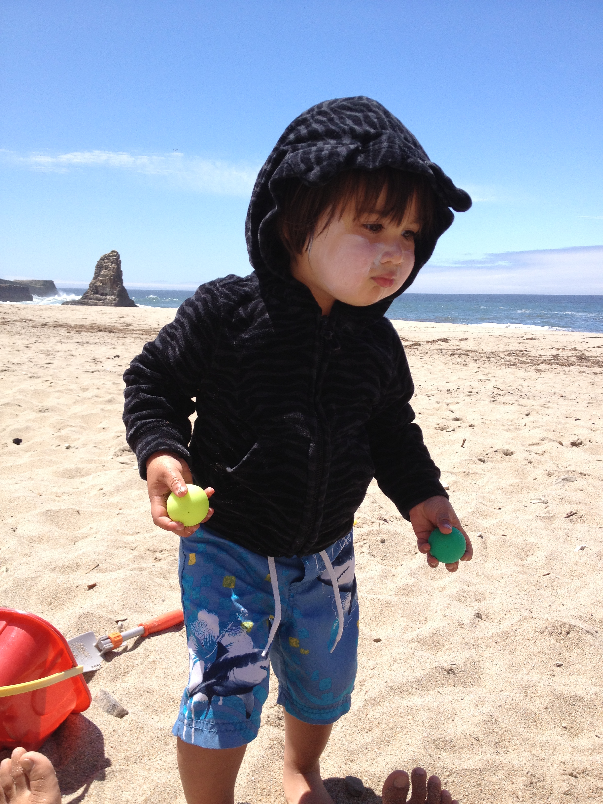 This morning, the first morning of our five day vacation in Davenport, we got to check out the beach. After a leisurely breakfast, we stuffed one backpack with snacks, towels, toys, and sunscreen. We crossed the highway, maneuvered down a small wall of rocks, hopped over some train tracks, and hiked down the grassy trail. We reached the beach by 11:00.