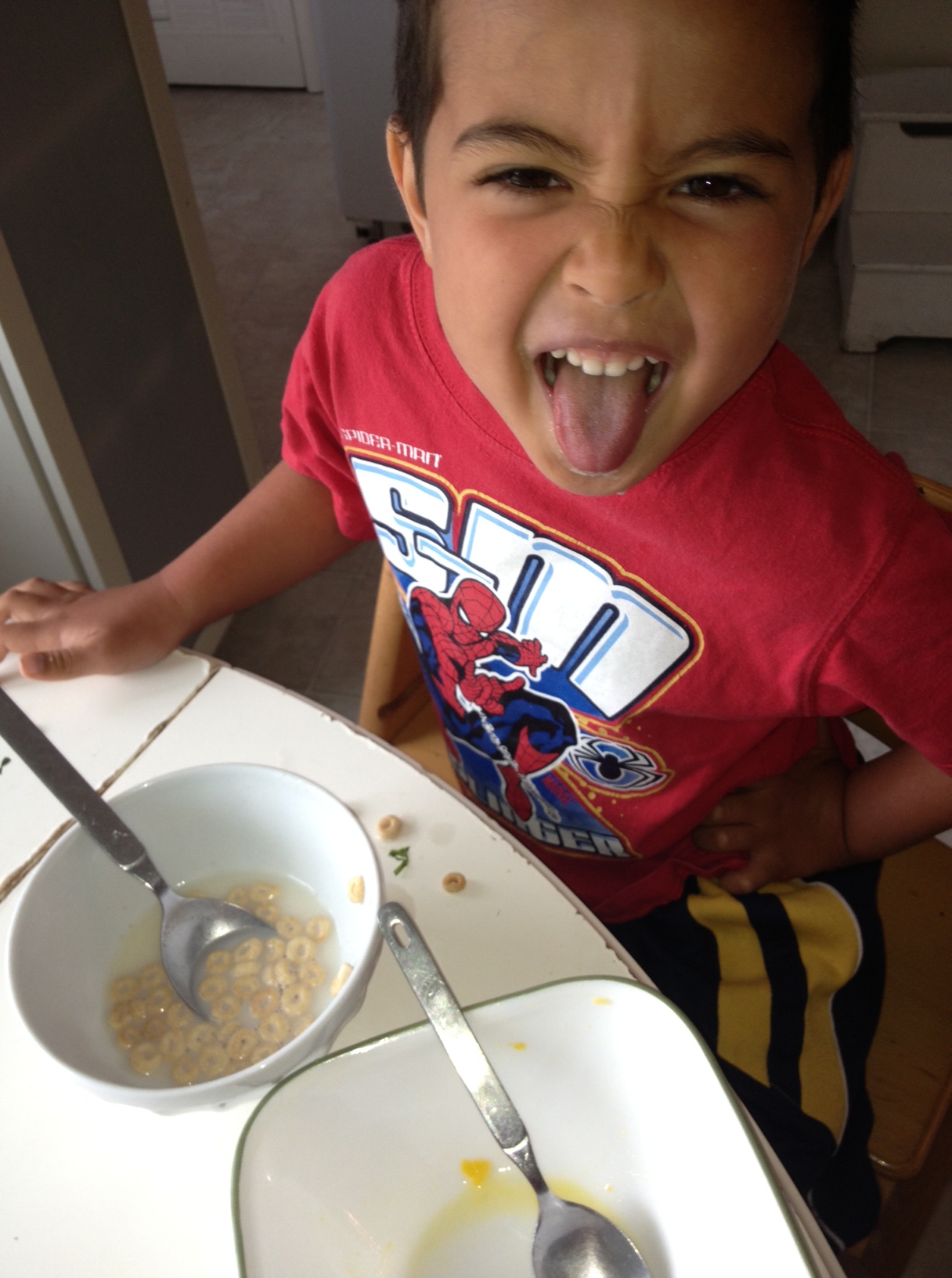 By the time we all straggle out of our room, Charlie would be on his second bowl of cereal and Jack would be so ready to have his breakfast that he would squeeze himself between his chair and table and not even call out “Stuck!.” We would serve Jack his cookie sheet “plate” filled with cheese, cheerios, scrambled eggs, toast, anything that we could find. He eats just about anything when he’s in the mood to eat. He used to eat with his hands but now he’s gotten the hang of spoon and fork and regular cups. Now he scowls at us when forget to give him his tools, and he shrieks his indignation when we try to spoonfeed him.